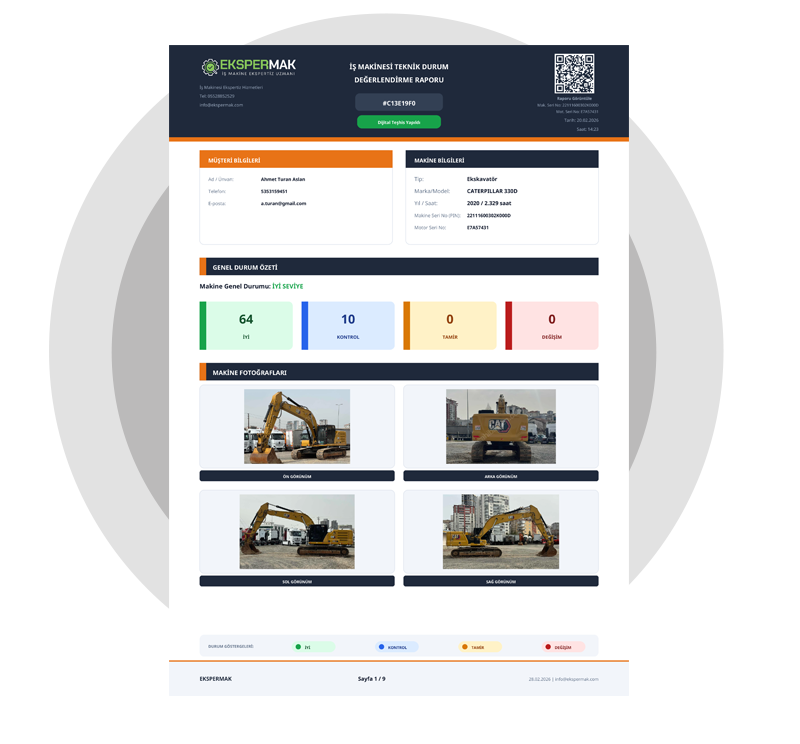 Ekspertiz raporlarımızda motor, şanzıman, yürüyüş takımı ve daha bir çok noktanın inceleme sonuçları rapor haline getirilir. Raporda, makinenin durumu, mevcut sorunlar ve önerilen bakım veya tamiratlar belirtilir.